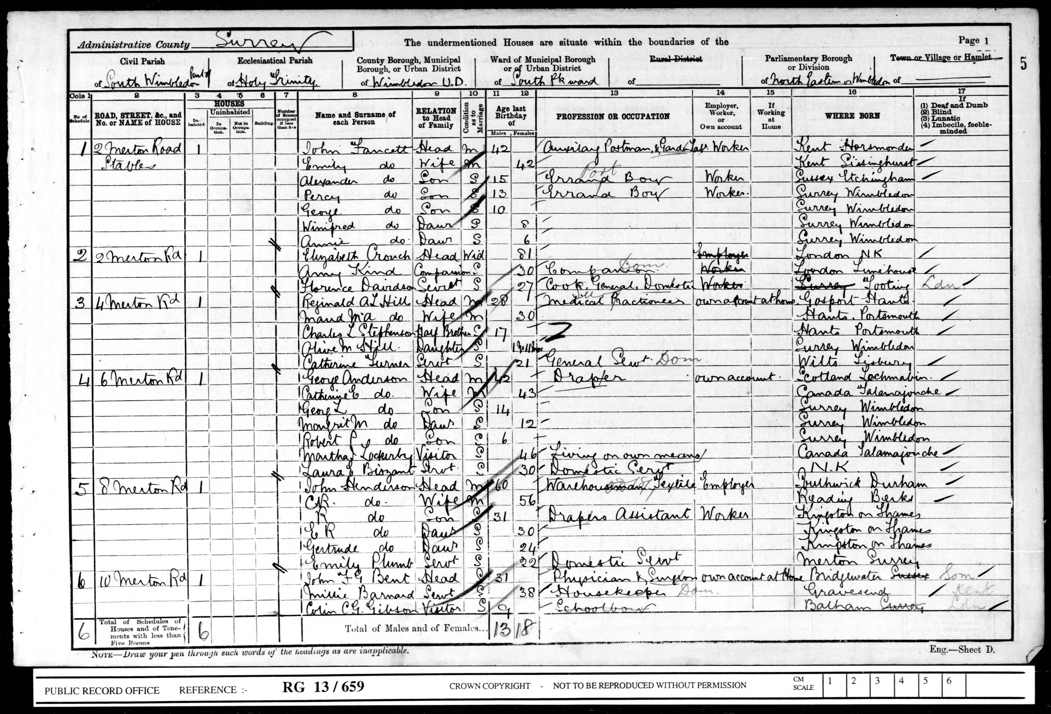 • Lived at: 10 Merton Road, 1901, South Wimbledon, Surrey. • Alt. Death: as per 1901 census possible, After 1901. 1 |