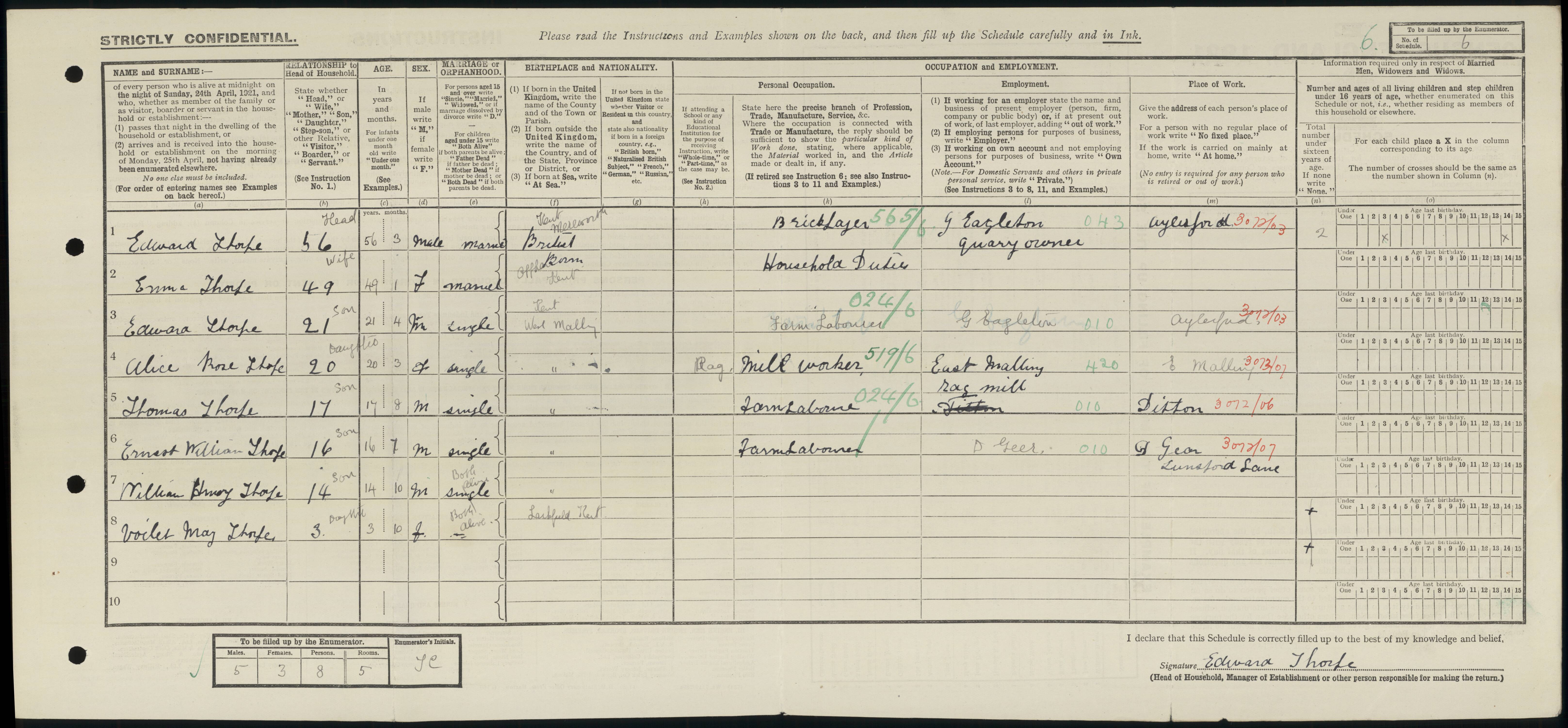 • Occupation: Retired Bricklayer, 1939, Malling R.D., Kent, England.