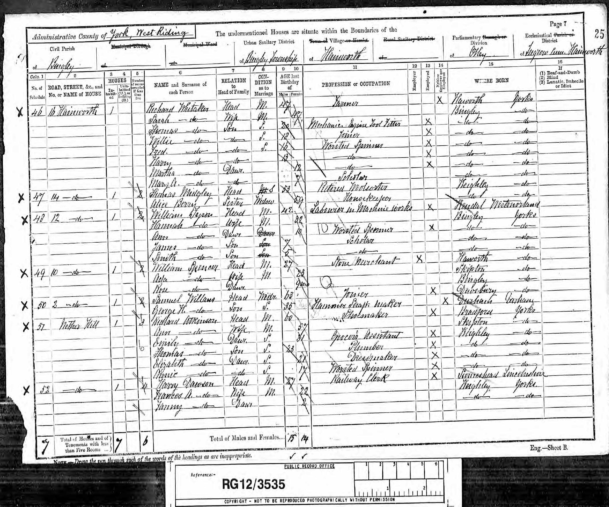 • Lived at: 2 Hainsworth, 1891, Bingley, Yorkshire. • Occupation: Joiner, 1891, Bingley, Yorkshire. Samuel married Mary. (Mary was born circa 1827 and died between 1871 and 1881.) |