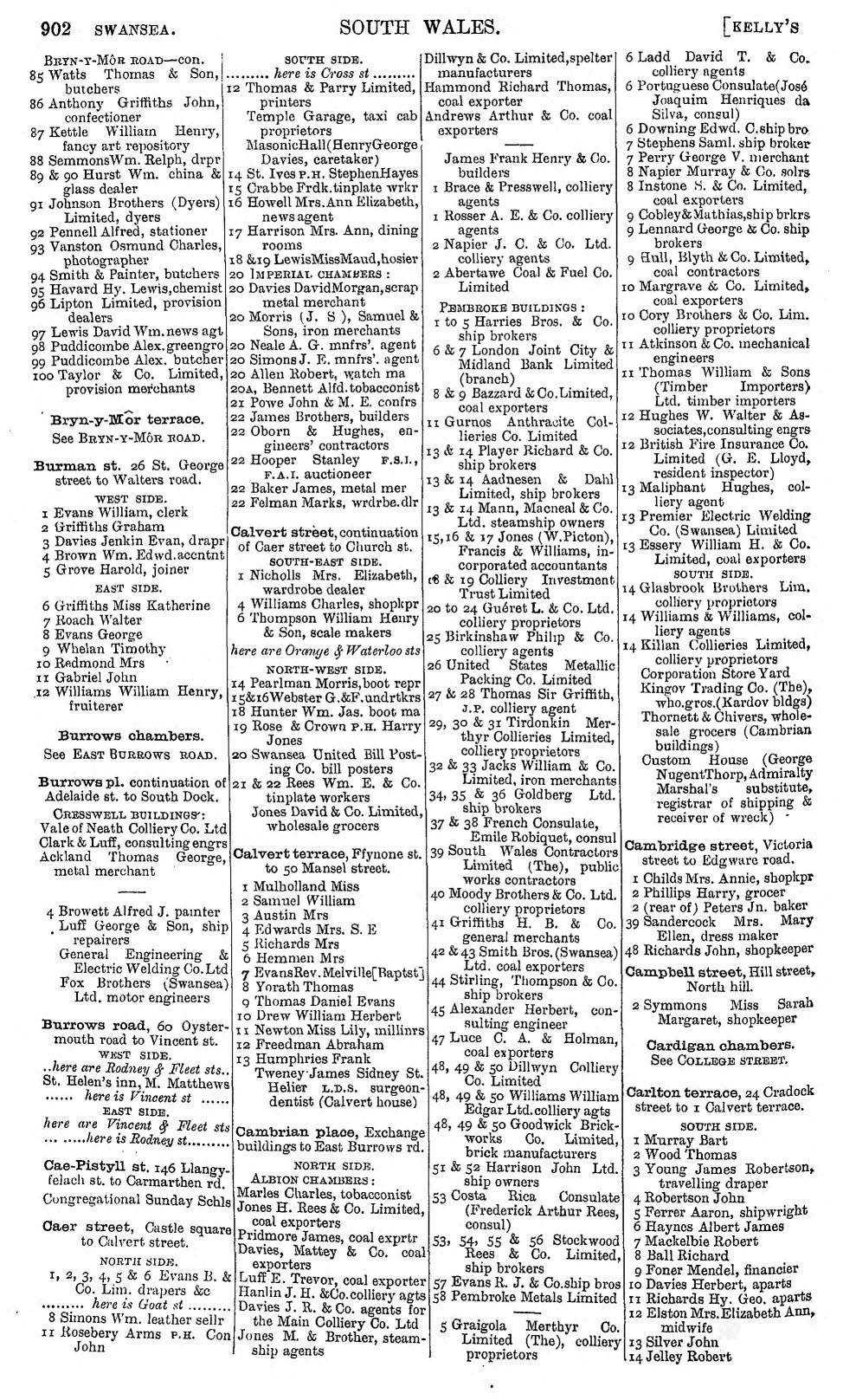 • Lived at: 21 Caer Street, 1911, Swansea, Glamorgan, Wales. • Occupation: Sugar Boiler, 1911, Swansea, Glamorgan, Wales. • Lived at: 21 Caer Street, 1921, Swansea, Glamorgan, Wales.