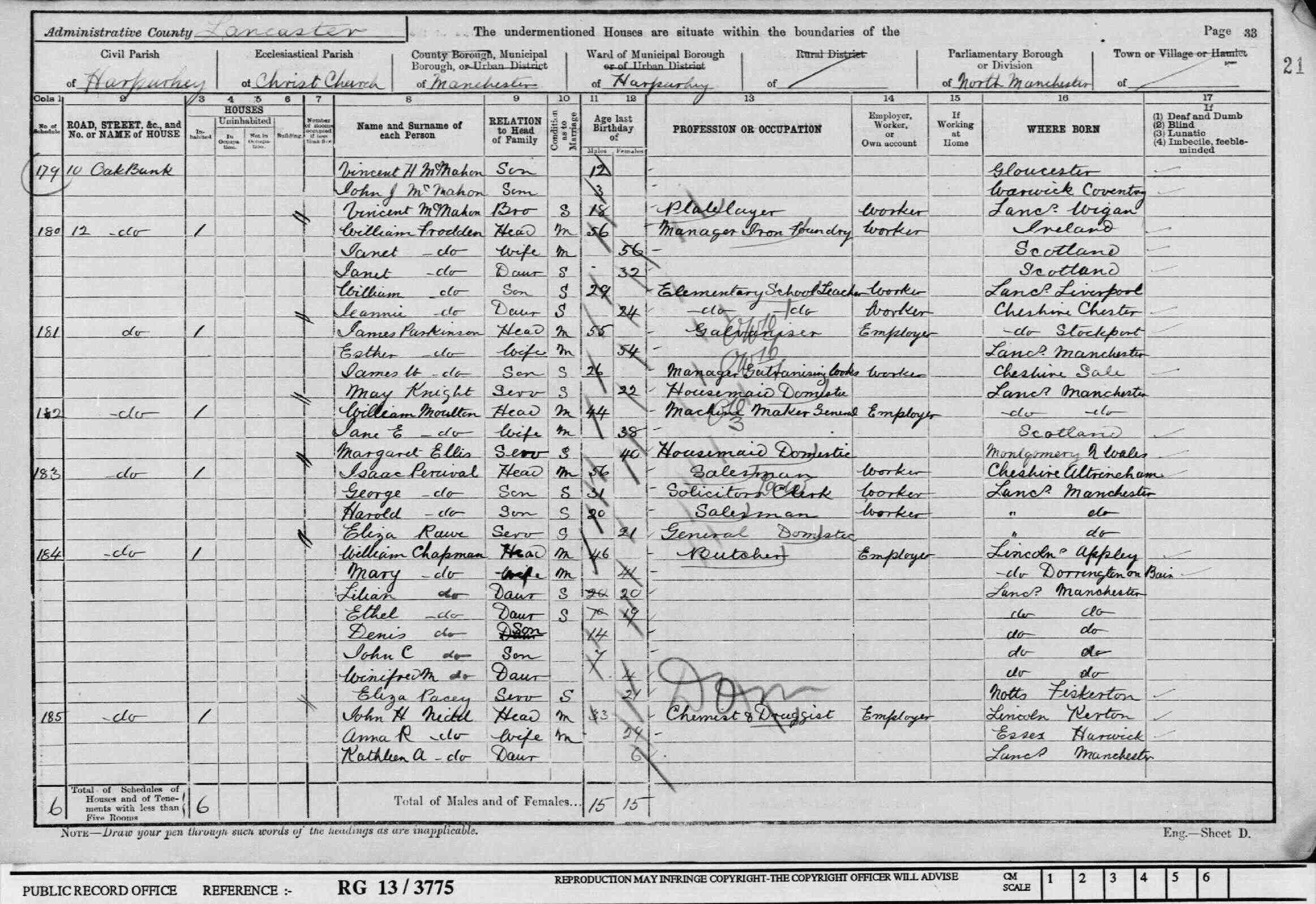 • Lived at: 12 Oak Bank, 1901, Harpurhey, Lancashire. 6 • Occupation: Chemist, 1901-1906, Harpurhey, Lancashire. 6