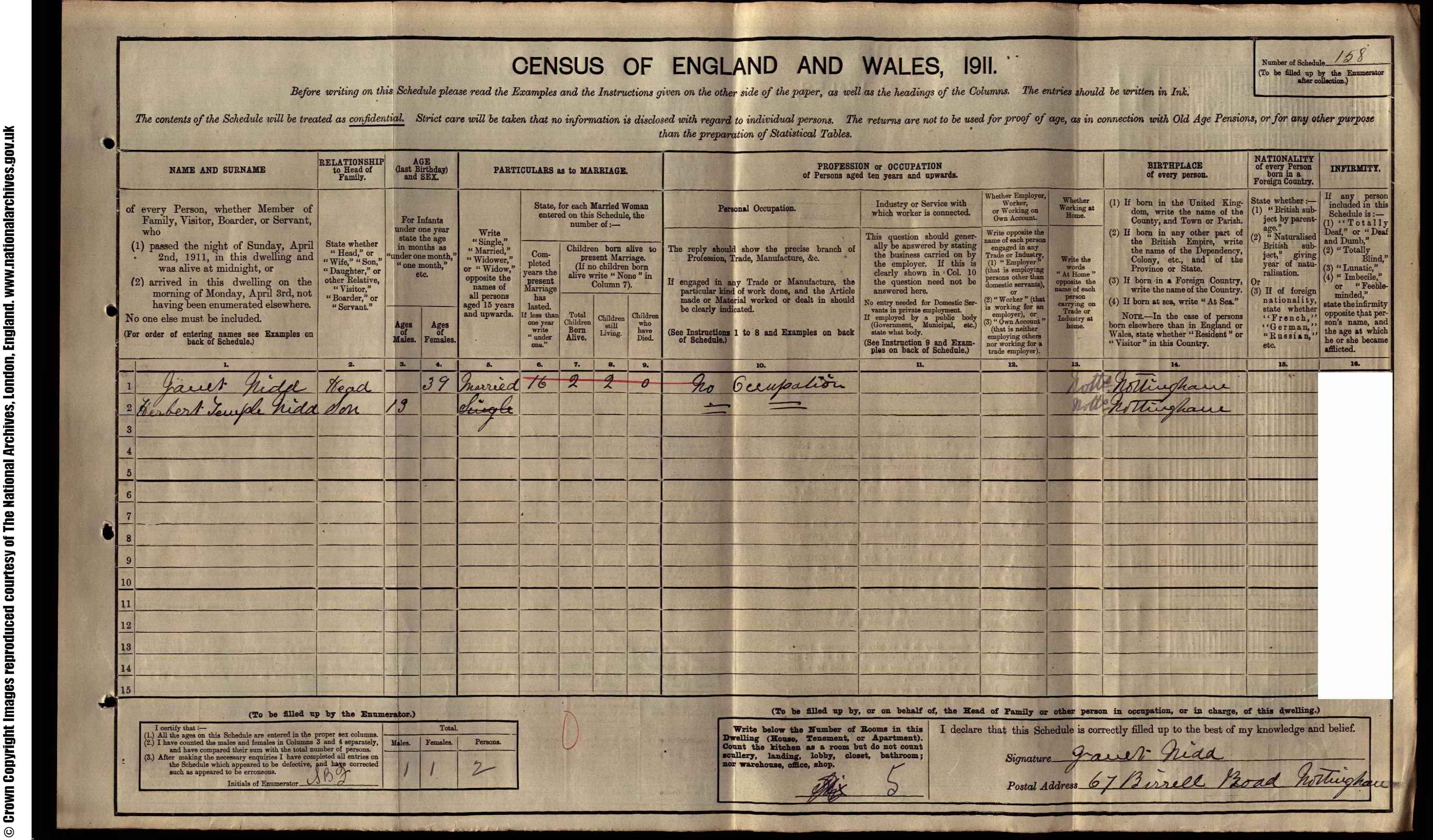 • Lived at: 67 Birrell Road, 2 Apr 1911, Nottingham, Nottingham, England. 7
