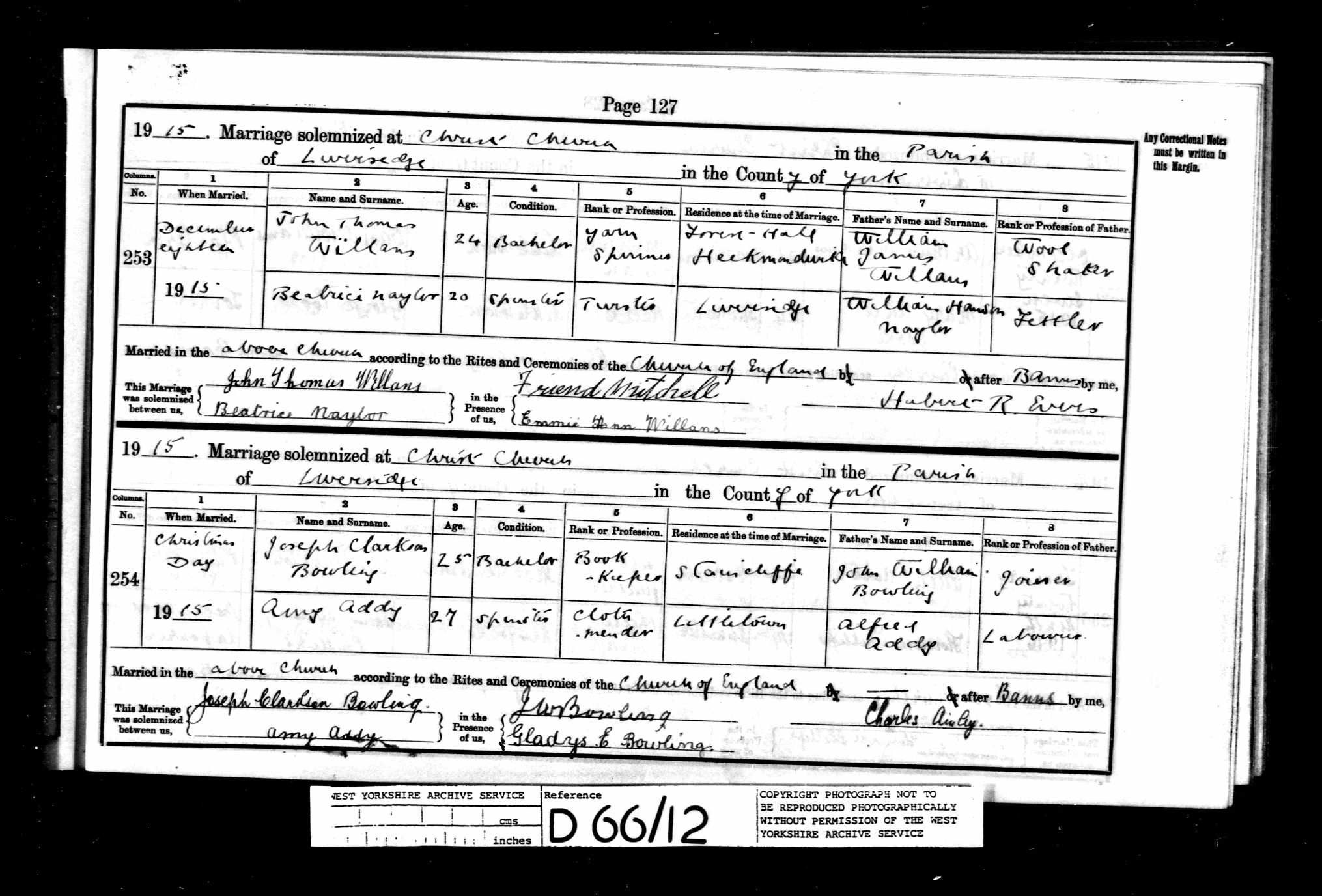 • Lived at: 110 Halifax Road, Staincliffe, 1911, Batley, Yorkshire, England. • Occupation: Book Keeper, 1915, Liversedge.