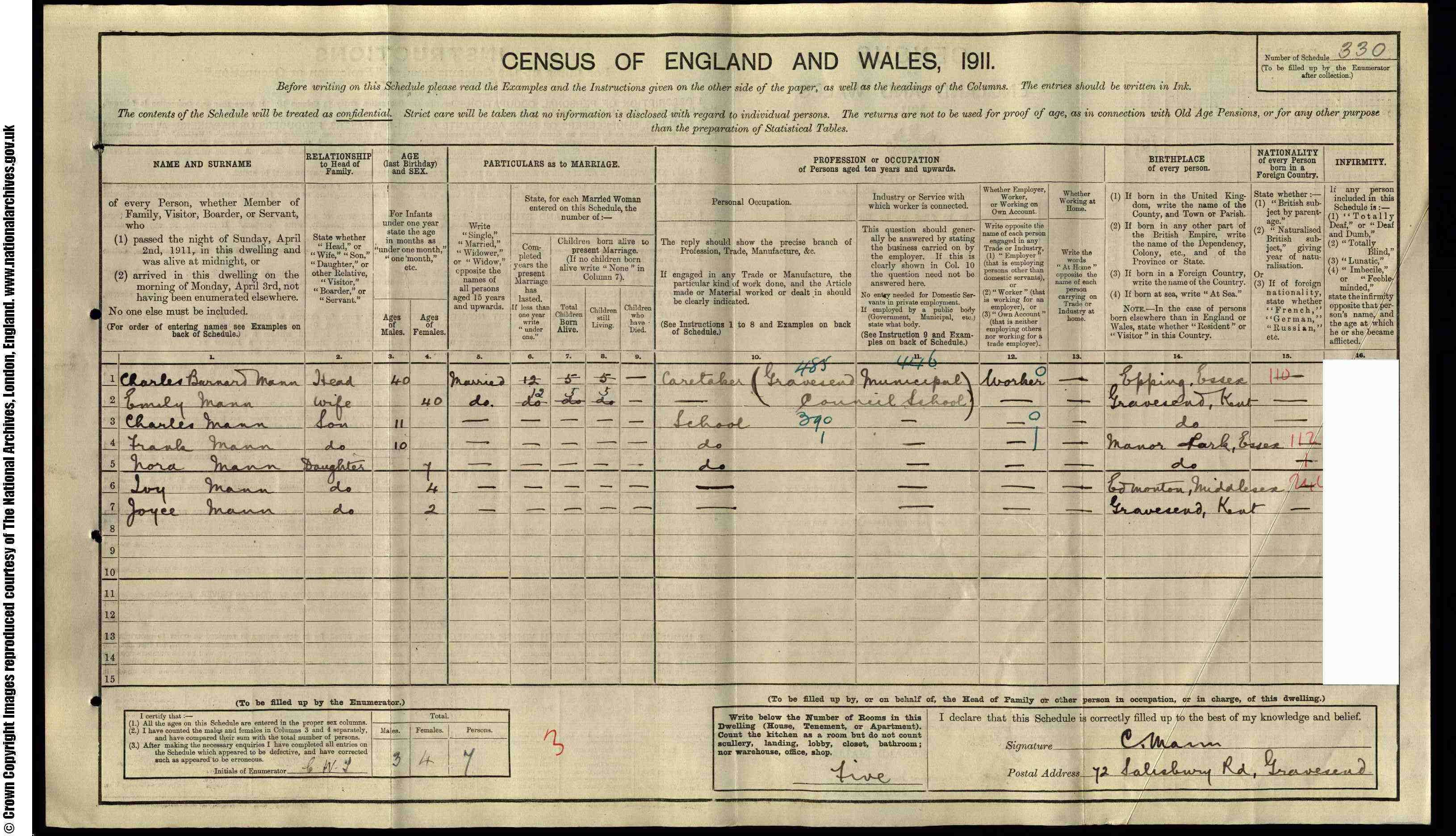 • Lived at: 72 Salisbury Road, 1911, Gravesend, Kent, England.