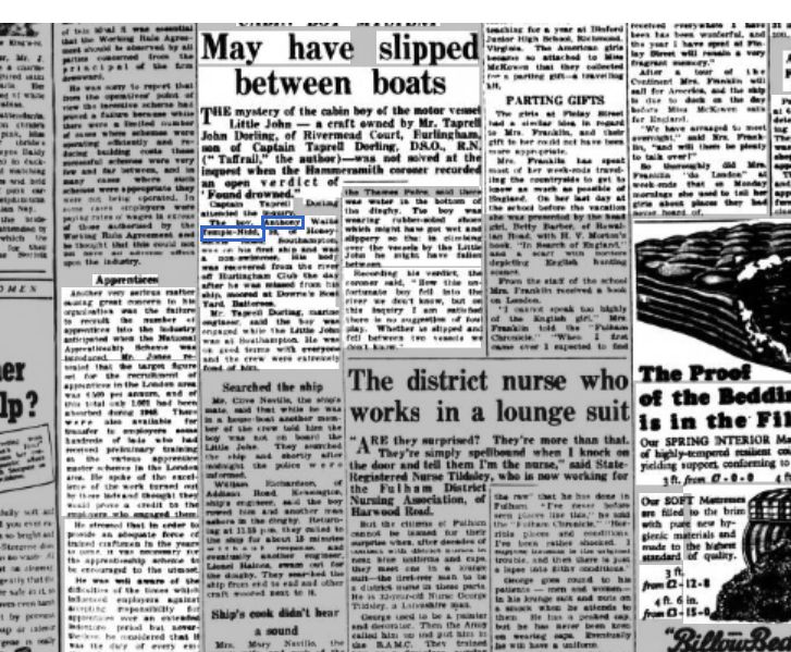 • Newspaper Article: Missing, 1949, Battersea, London, Middlesex. Thames River Police today searched for Anthony Temple-Nidd aged 16, of 20 Honeysuckle Road, Southampton, cabin-boy on the Little John, a motor-yacht moored off Dewres boat yard Battersea. Anthony disappeared between 10 and 11.30 last night. It is understood that he rowed two members of the crew to the shore. later the skiff was found tied up to the Little John, but there was no sign of the boy. He could not swim, and the police assume that he fell overboard and was drowned. WANTED TO GO TO SEA Mrs. Temple-Nidd, Anthony's mother, told the "Echo" today that he had always longed to go to sea. Small for his age - four feet ten inches he found his ambition difficult to achieve until he answeredan "Echo" advertisement for a post on the Little John. It is believed that the yacht was to leave shortly for a trip to the Mediterranean. "Anthony was very happy in his job." she said Anthony's 17th birthday would have been next week. He had been with the Little John for six months. Previously he worked at the Odean Cineman adn the Polygon Hotel. Anthony's father, who was for 17 years with the Cunard White Star died suddenly four years ago when serving as a paymaster-lieutenant in the Royal Navy. There are five other children. Anthony's eldest brother is in the Army, and there are four younger