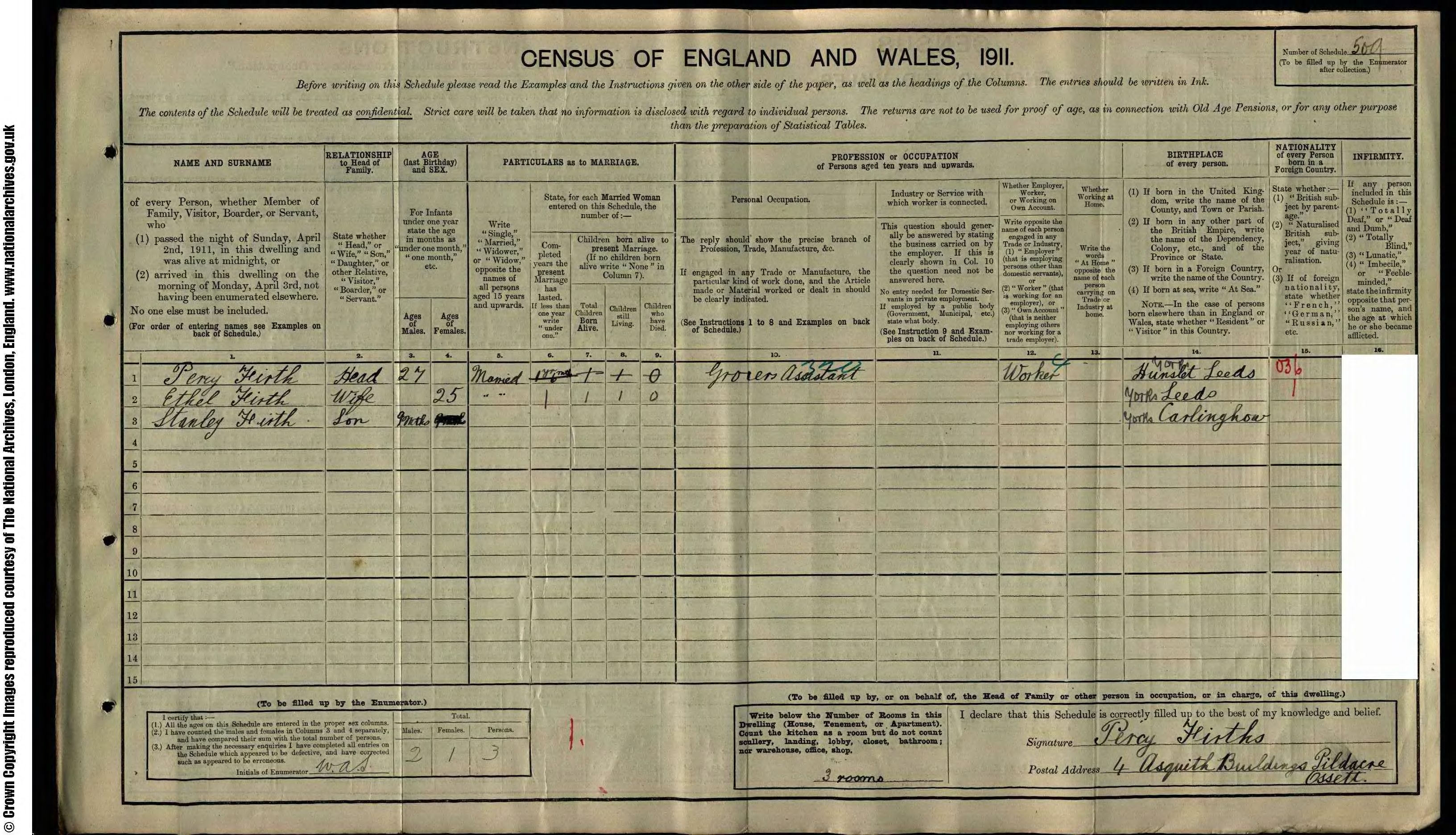 Events • Lived at: 4 Asquith Building, Pildacre, 1911, Ossett, Yorkshire, England.