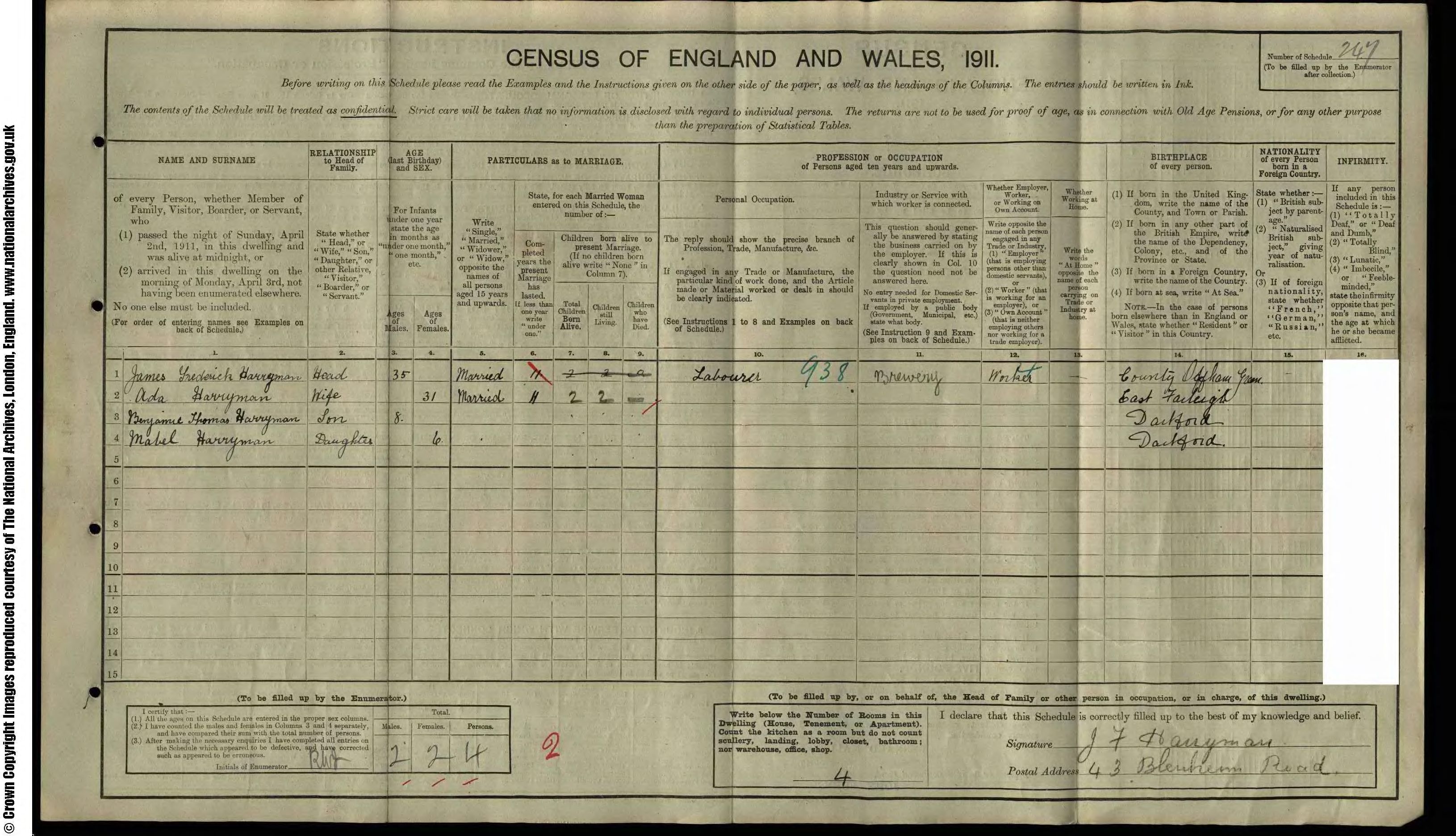 • Lived at: 43 Blenheim Road, 1921-1957, Dartford, Kent, England. • Occupation: Brewer's Drayman, 1921, Dartford, Kent, England. • Occupation: Iron Foundry Worker, Sep 1939, Dartford, Kent, England.