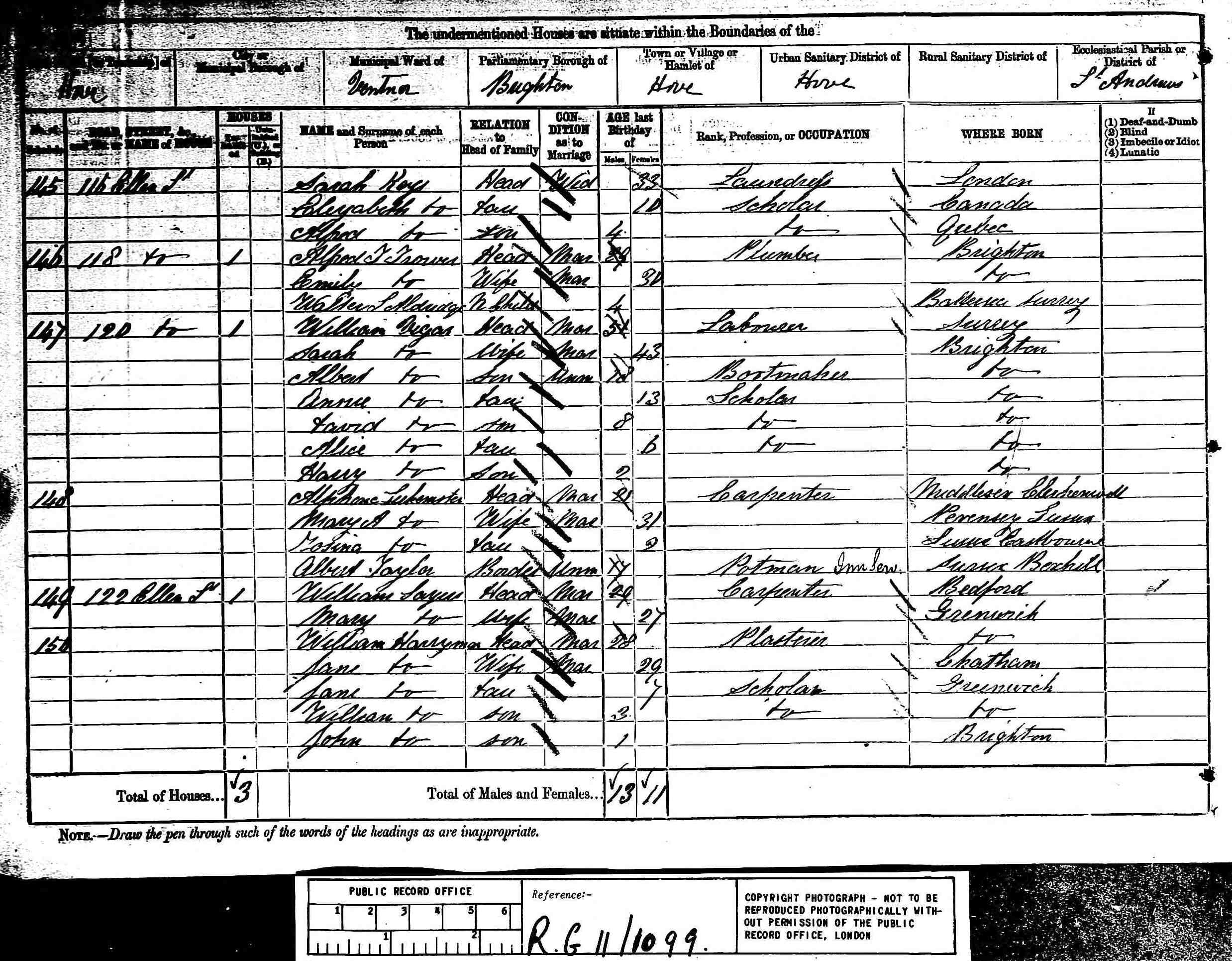 • Lived at: 122 Ellen Street, 1881, Brighton, Sussex, England. 6 • Occupation: Plasterer, 1881, Brighton, Sussex, England. 6 William married Jane Elizabeth Deane on 10 Aug 1873 in Greenwich, Kent, England.1 (Jane Elizabeth Deane was born in 1851 in Chatham, Kent, England 6 and died Jun Q 1922 in Greenwich, Kent, England 6.) |